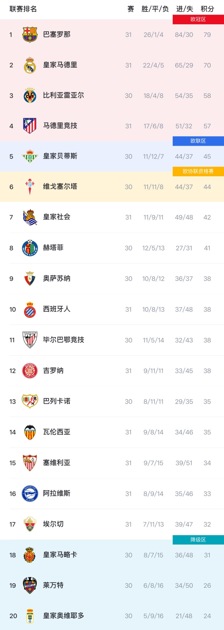 欧战区方面,皇家贝蒂斯(45分)和塞尔塔(44分)本轮尚未出战;皇家社会31轮42分暂列第七。中游多队积分集中在38分左右,排名仍有变数。