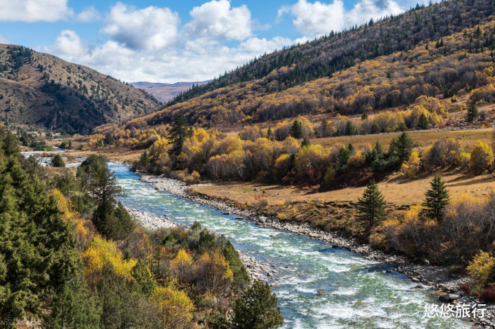 川西高原最早的秋天,海拔较高,原始森林叠着金黄草原。9月下旬,树叶黄绿相间,金黄的松萝垂挂在冷杉枝桠,绛红的狼毒草铺满河谷,而远处的雪峰仍顶着终年不化的白。