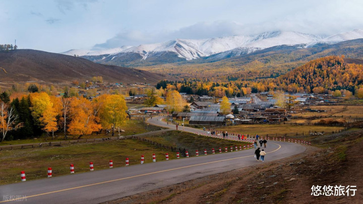边境的白哈巴已经下了一场雪,山体从低处的金色森林,一直过渡到高处的皑皑白雪。