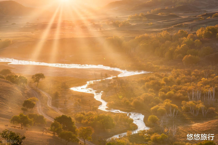 额尔古纳湿地已经变得五彩斑斓,河流在金色草甸之间蜿蜒。在黑山头看一次色彩浓艳的草原日落,暮光无限拉长。