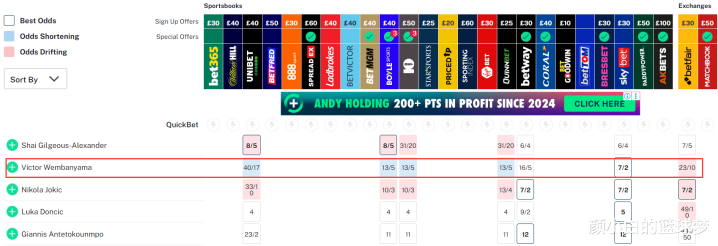 除此之外,文班亚马的MVP赔率也仅次于亚历山大排在第二的位置,雷霆、马刺目前都是三连胜,马刺冲到西部第二这你敢相信吗?