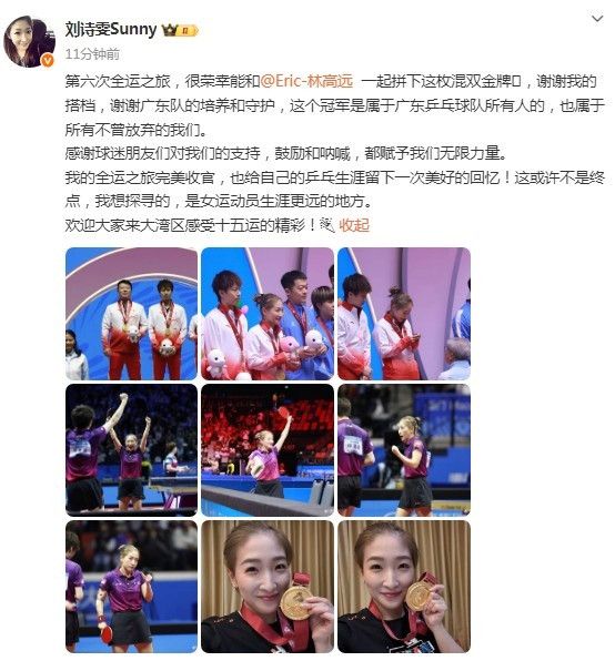 第六次全运之旅,很荣幸能和林高远一起拼下这枚混双金牌,谢谢我的搭档,谢谢广东队的培养和守护,这个冠军是属于广东乒乓球队所有人的,也属于所有不曾放弃的我们。