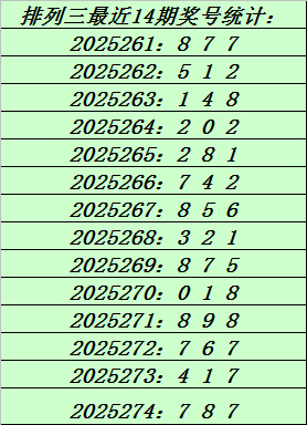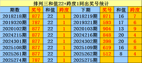 上期回顾:排列三第2025274期奖号:787。和值22,跨度1。