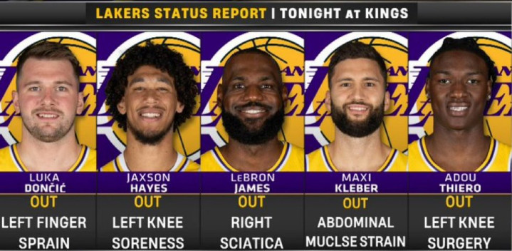 湖人伤病满营,东契奇、詹姆斯、海斯、阿杜-蒂耶罗及克勒贝尔都因伤无法出战,今日对阵国王,湖人被迫变阵,斯马特顶替东契奇进入首发阵容,另外四名首发是里夫斯、文森特、艾顿和八村垒。