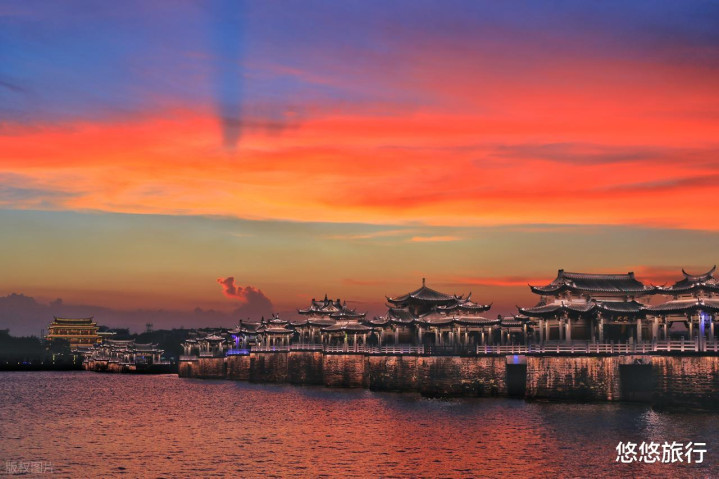 中国四大古桥之一的广济桥,为通船设计的活动浮桥,每天下午5点“拆桥”, 夕阳下古桥与韩江相映。