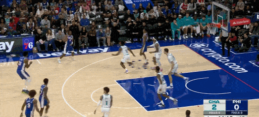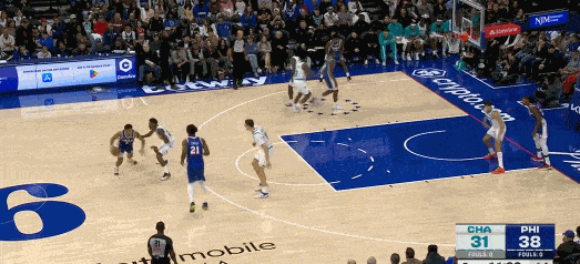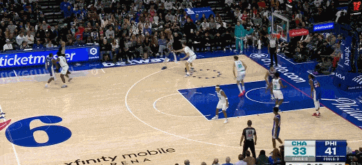 VJ-埃奇库姆和恩比德打挡拆,随后分球给下顺的恩比德,恩比德强打穆萨-迪亚巴特2+1打中。