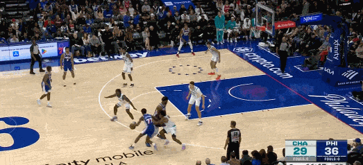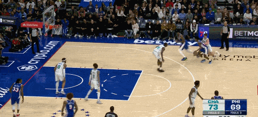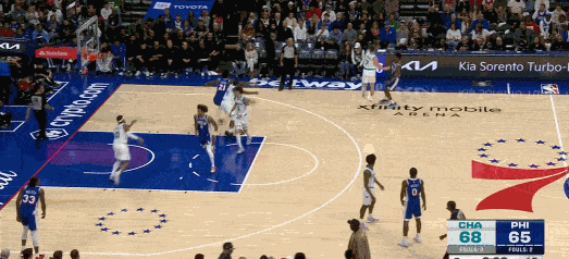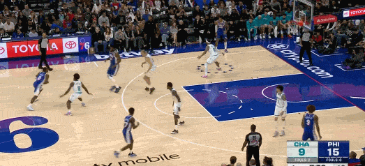 恩比德与马克西打挡拆,面对普拉姆利的防守,三分远射投进。