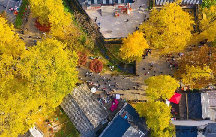 可重点游逛“大岕口村道”【青石板路铺满落叶,踩上去簌簌响,老宅旁的文创小店和咖啡馆,随手拍都是治愈感】,“空王教寺”【秋冬之际黄墙黛瓦映金黄,可抛洒银杏叶拍“落叶雨”,而且古寺飞檐+1500年银杏皇后同框,禅意拉满】,“古银杏皇后”【1530岁的古树需四人合抱,穿浅色系衣服站树下,仰头就是漫天金箔雨】等存在,简直是古偶现场!